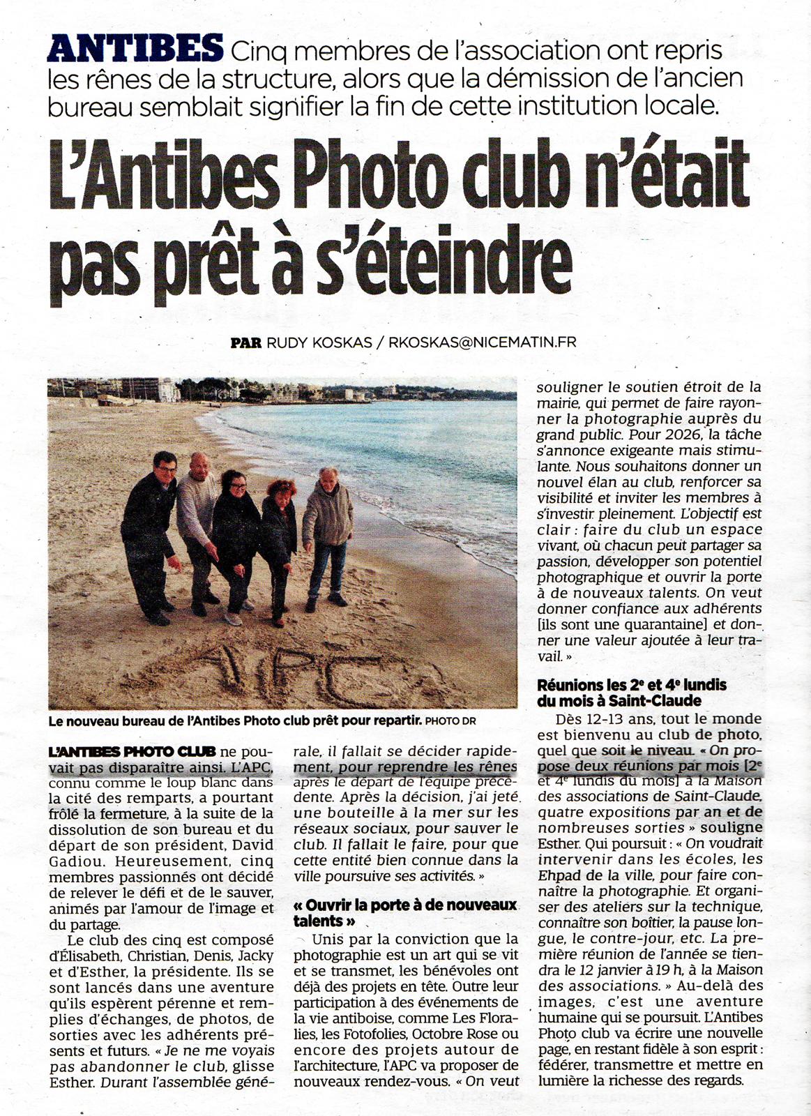 L’Antibes Photo Club a frôlé le silence… mais c’est une renaissance qui s’annonce.Dans un article paru dans Nice-Matin, la presse locale revient sur le tournant décisif qu’a connu notre association : après la démission de l’ancien bureau, cinq membres passionnés ont uni leurs forces pour préserver ce lieu de partage […]